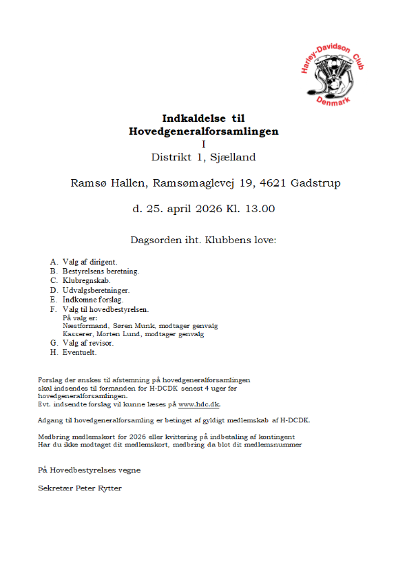 Hovedgeneralforsamlingen afholdes i 2025 for første gang på Bornholm. Sæt X i kalenderen d. 26. april 2025 og kom til generalforsamling på solskinsøen. Generalforsamlingen afholdes i Distrikt 6's klubhus på Skansevej 1 B, 3700 Rønne kl. 13.00